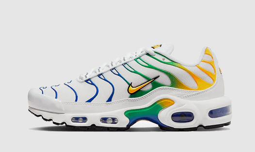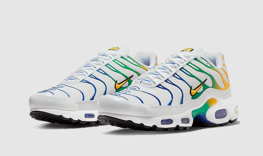 La Nike Air Max Plus Brazil présente une base en mesh couplée à du synthétique. Côté couleurs, on retrouve une dominance de blanc, contrastée par quelques rappels de vert, bleu et jaune sur les vagues qui rappellent le drapeau du Brésil. Une unité Air Sole bleue vient finaliser le design.